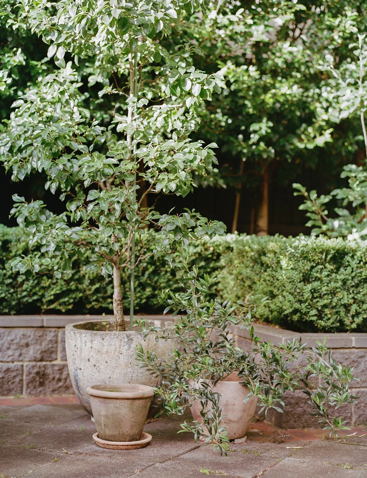 Scattered potted plants add height and texture to the backyard space.